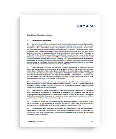 Les Conditions Générales d’Achat définissent le cadre contractuel qui régit les relations entre Ipsen et ses fournisseurs. Elles reflètent les exigences du Groupe en matière de qualité, d’éthique, de conformité et de performance, et permettent d’assurer une collaboration claire, responsable et alignée avec les engagements d’Ipsen.