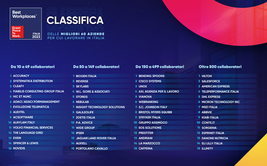 Per stilare questa Classifica, Great Place to Work® Italia ha condotto una ricerca durata un anno, ha analizzato oltre 300 aziende che hanno chiesto di prendere parte al progetto, ascoltando le opinioni riguardo all’ambiente di lavoro delle proprie persone: 163.000 collaboratori in Italia e nel Mondo, appartenenti alle stesse organizzazioni hanno partecipato alla survey di clima aziendale.